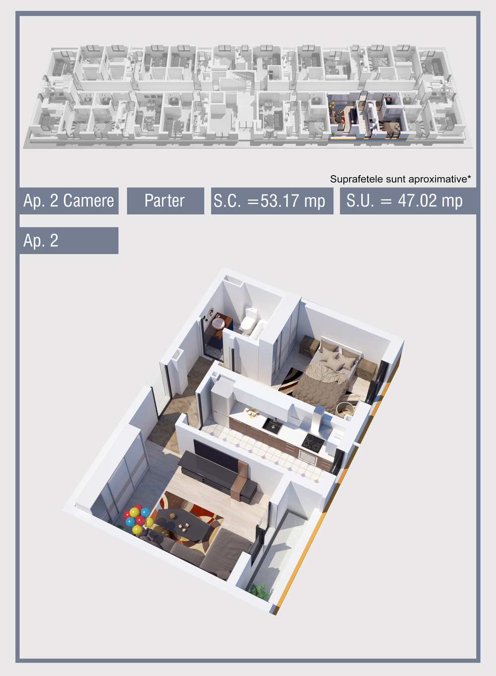 | 2 | Demisol | 2 | Da | 47.02 mp2 | - | - | - | Rezervat | Ap. 2 | - | Detalii |