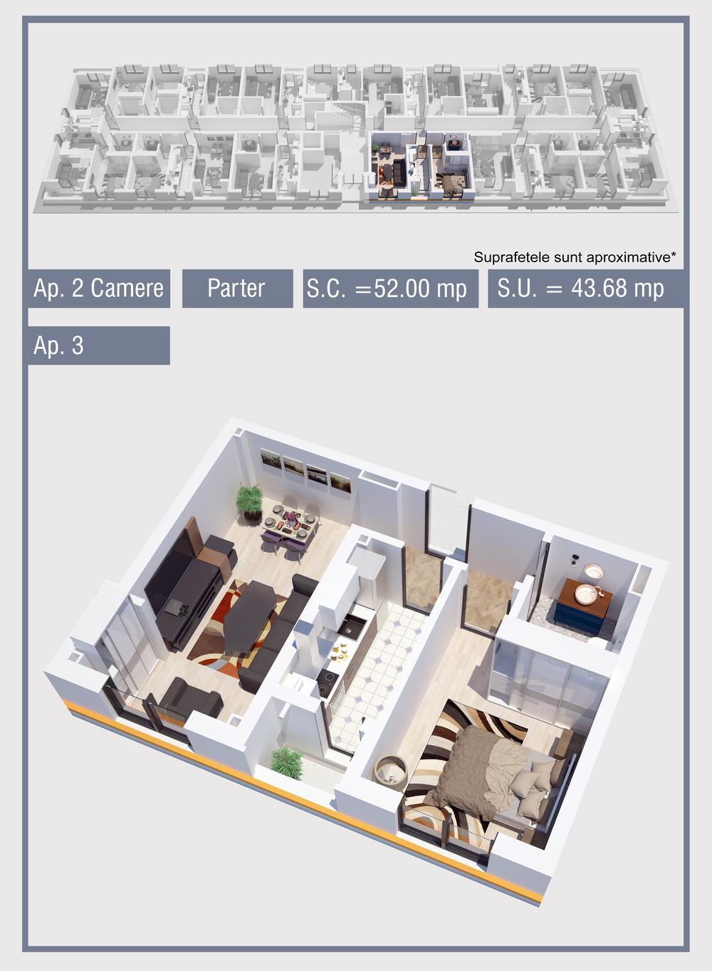 | 3 | Demisol | 2 | Da | 43.68 mp2 | - | - | - | Rezervat | Ap. 3 | - | Detalii |