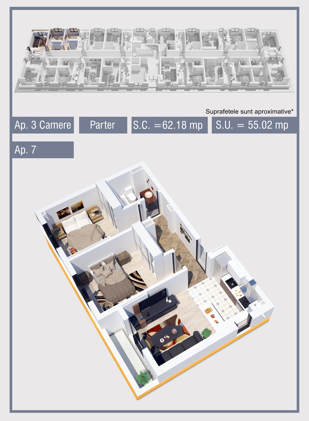 | 7 | Demisol | 3 | Da | 55.02 mp2 | - | - | - | Rezervat | Ap. 7 | - | Detalii |