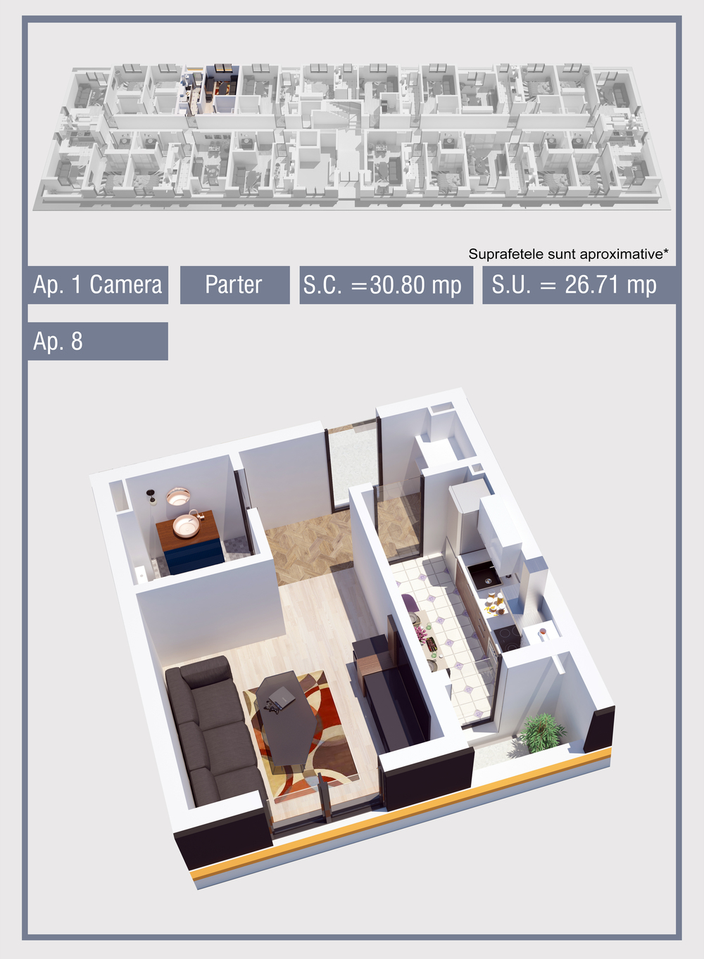 | 8 | Demisol | 1 | Da | 26.71 mp2 | - | - | - | Rezervat | Ap. 8 | - | Detalii |