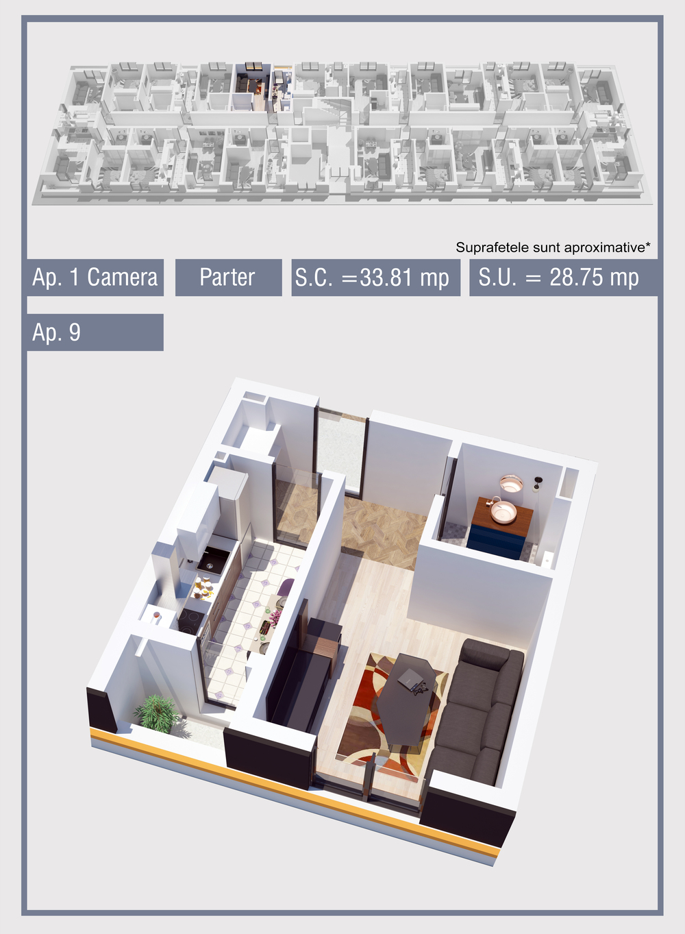 | 9 | Demisol | 1 | Da | 29.16 mp2 | - | - | - | Rezervat | Ap. 9 | - | Detalii |