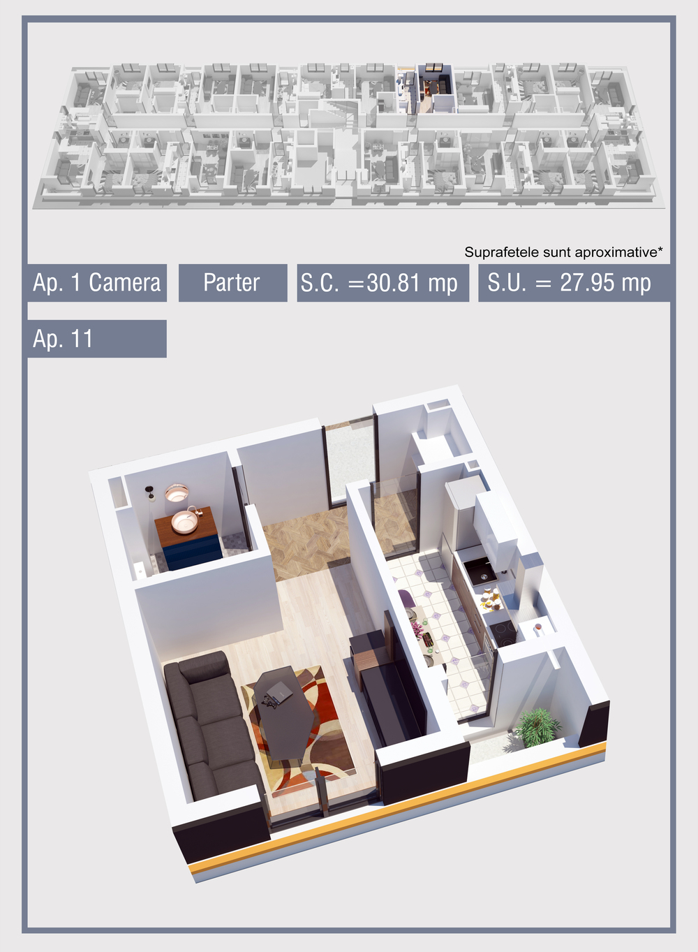 | 11 | Demisol | 1 | Da | 27.95 mp2 | - | - | - | Rezervat | Ap. 11 | - | Detalii |