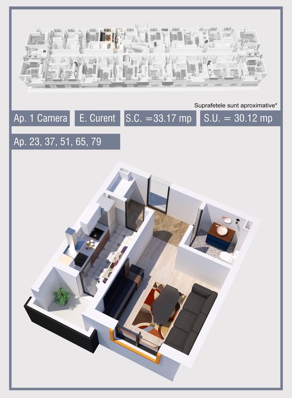 | 79 | Etaj 4 | 1 | Da | 30.12 mp2 | - | - | - | Rezervat | Ap. 79 | - | Detalii |