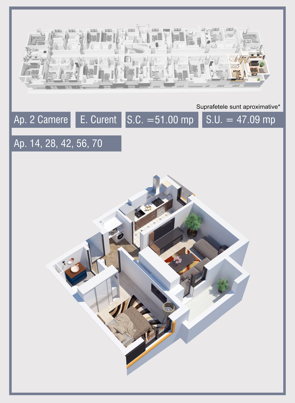 | 70 | Etaj 4 | 2 | Da | 47.09 mp2 | - | - | - | Rezervat | Ap. 70 | - | Detalii |