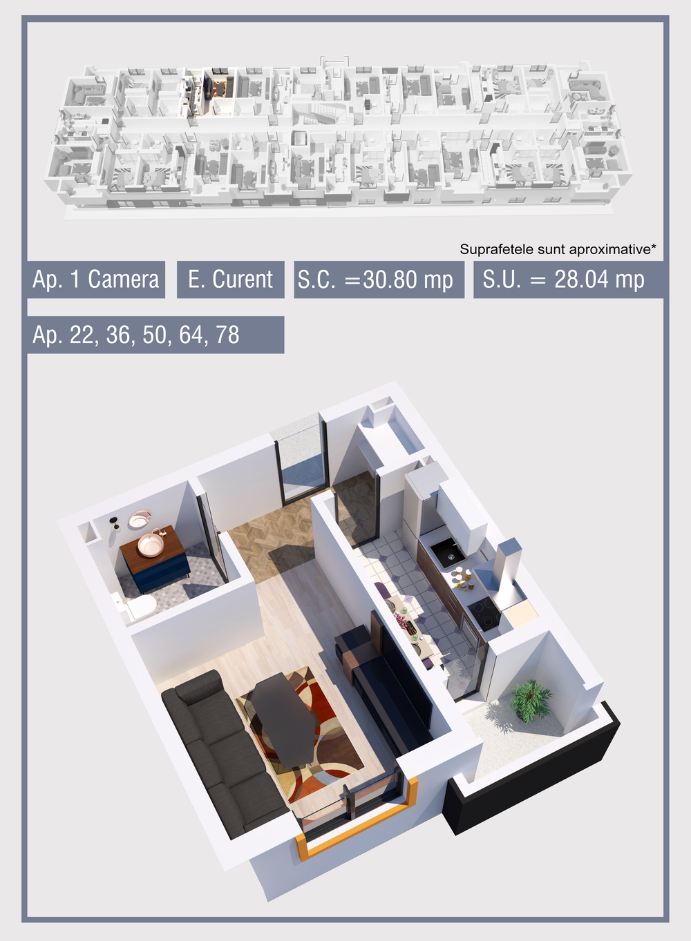| 22 | Parter | 1 | Da | 28.04 mp2 | - | - | - | Rezervat | Ap. 22 | - | Detalii |