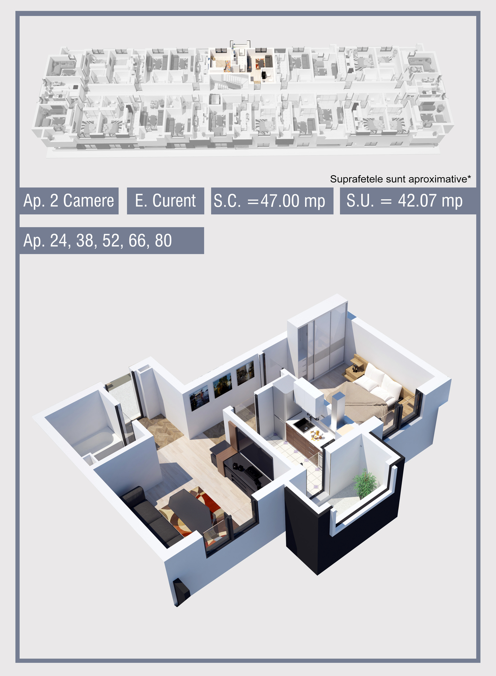 | 42 | Etaj 2 | 2 | Da | 47.09 mp2 | - | - | - | Rezervat | Ap. 42 | - | Detalii |