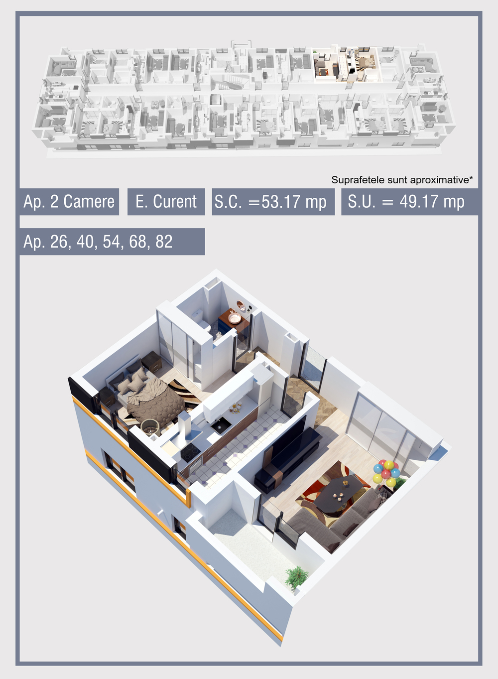 | 82 | Etaj 4 | 2 | Da | 49.17 mp2 | - | - | - | Rezervat | Ap. 82 | - | Detalii |