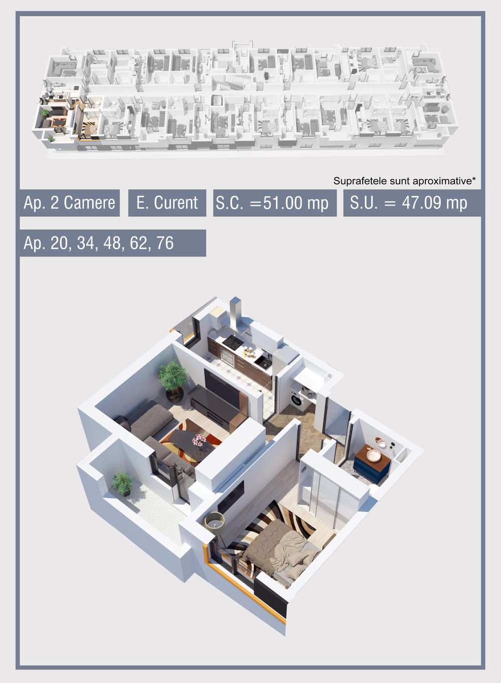 | 62 | Etaj 3 | 2 | Da | 47.09 mp2 | - | - | - | Rezervat | Ap. 62 | - | Detalii |
