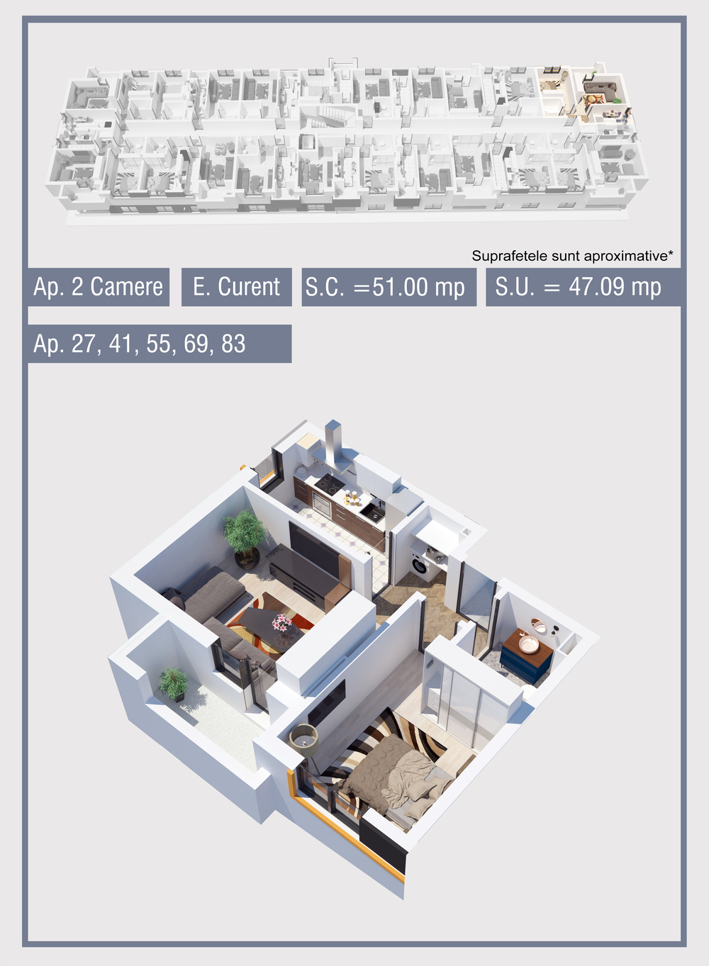 | 55 | Etaj 2 | 2 | Da | 47.09 mp2 | - | - | - | Rezervat | Ap. 55 | - | Detalii |