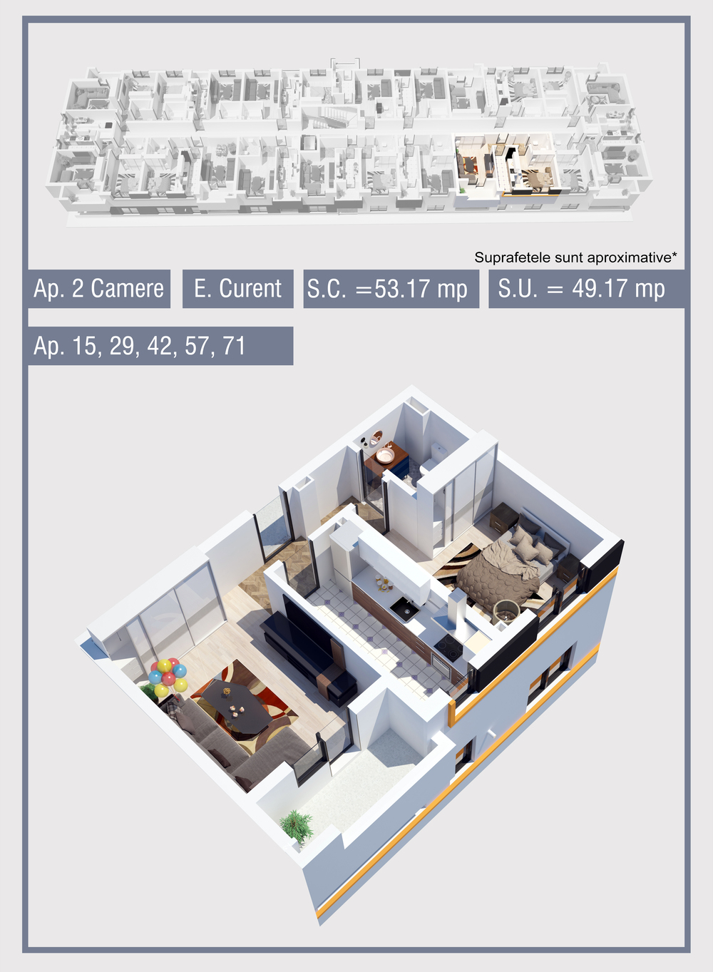 | 57 | Etaj 3 | 2 | Da | 49.17 mp2 | - | - | - | Rezervat | Ap. 57 | - | Detalii |