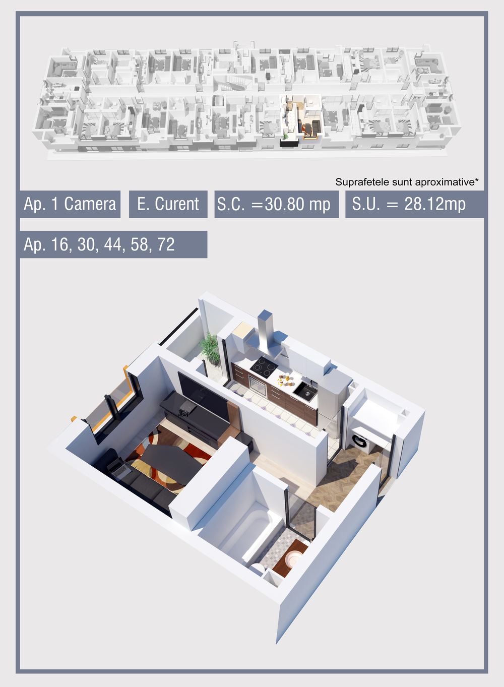 | 30 | Etaj 1 | 1 | Da | 28.12 mp2 | - | - | - | Rezervat | Ap. 30 | - | Detalii |