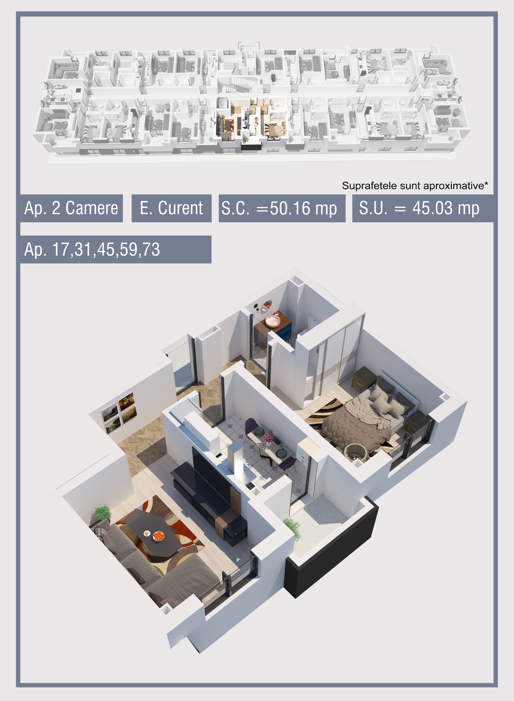 | 45 | Etaj 2 | 2 | Da | 45.03 mp2 | - | - | - | Rezervat | Ap. 45 | - | Detalii |