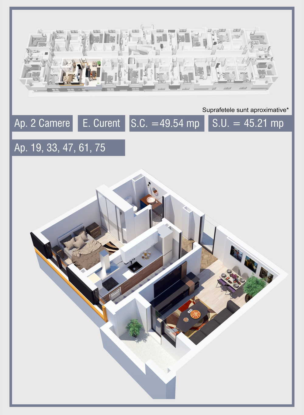 | 61 | Etaj 3 | 2 | Da | 45.21 mp2 | - | - | - | Rezervat | Ap. 61 | - | Detalii |