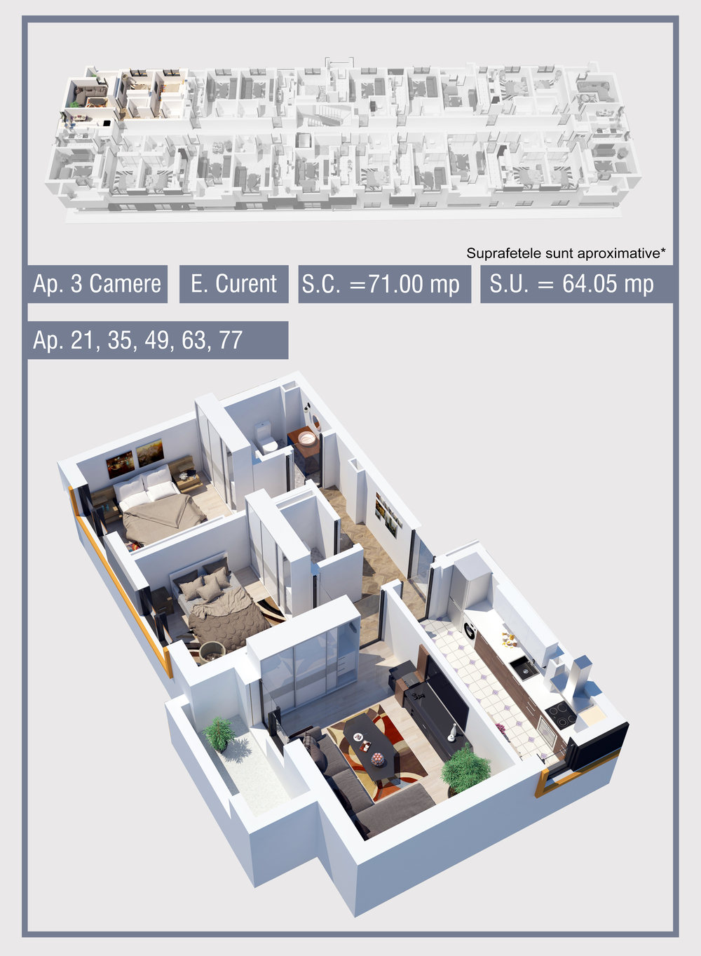 | 35 | Etaj 1 | 3 | Da | 64.05 mp2 | - | - | - | Rezervat | Ap. 35 | - | Detalii |