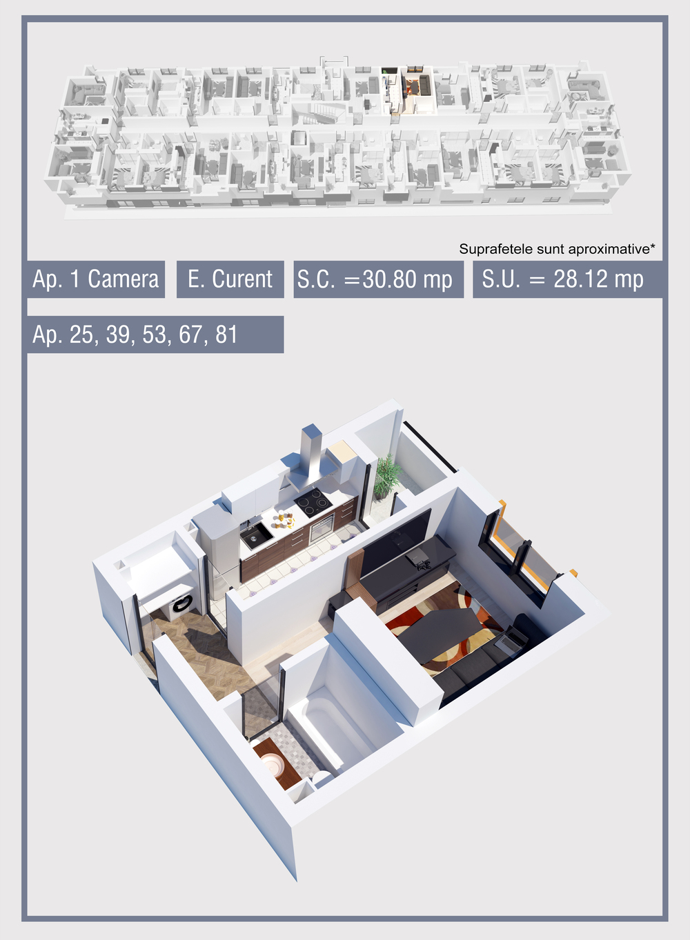 | 81 | Etaj 4 | 1 | Da | 28.12 mp2 | - | - | - | Rezervat | Ap. 81 | - | Detalii |